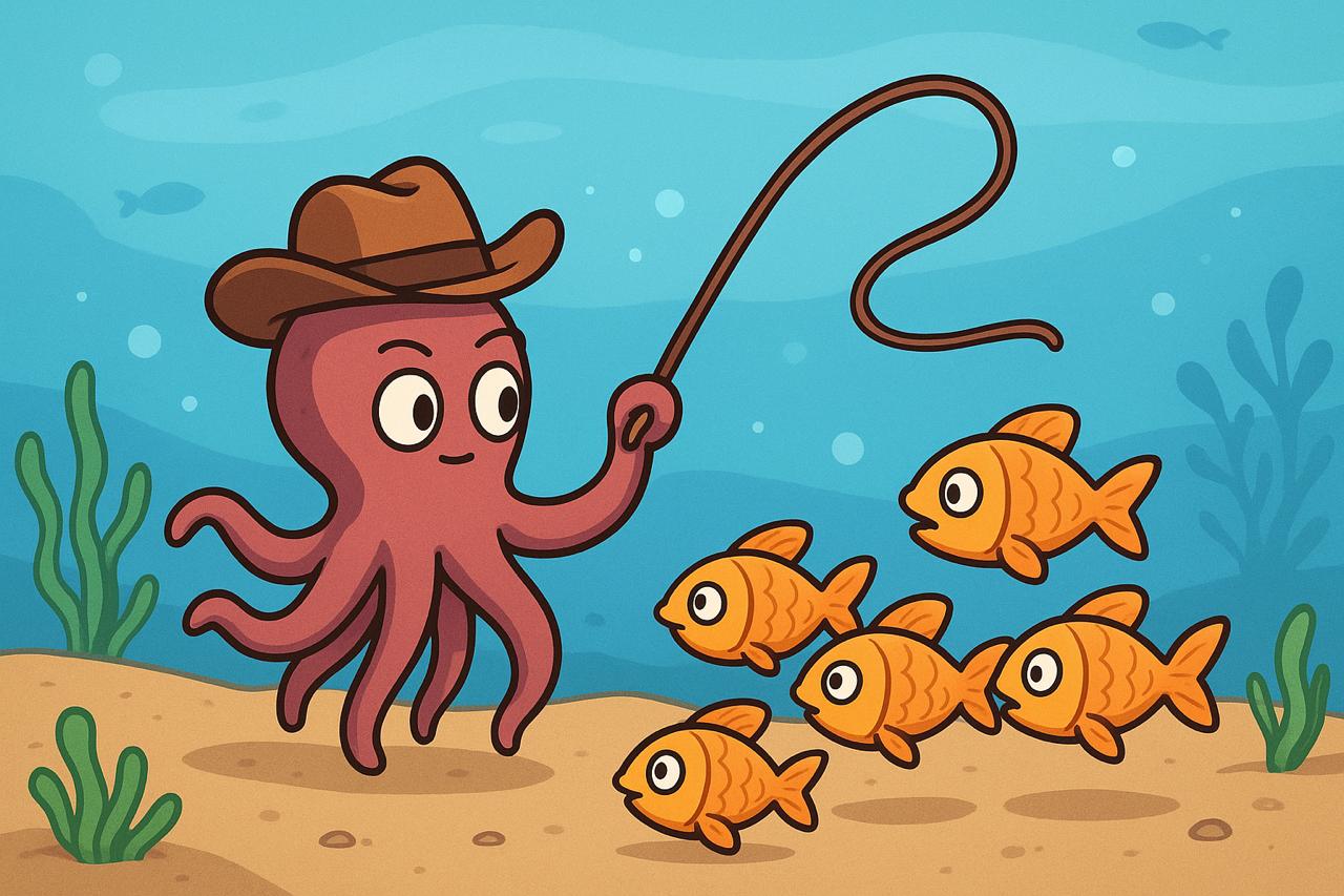 Осьминоги, эти интеллектуалы моря, собирают рыб в стаи и пасут их. Но иногда бьют щупальцем своих рыб-напарников просто так, от злости и плохого настроения. Узнаёте?